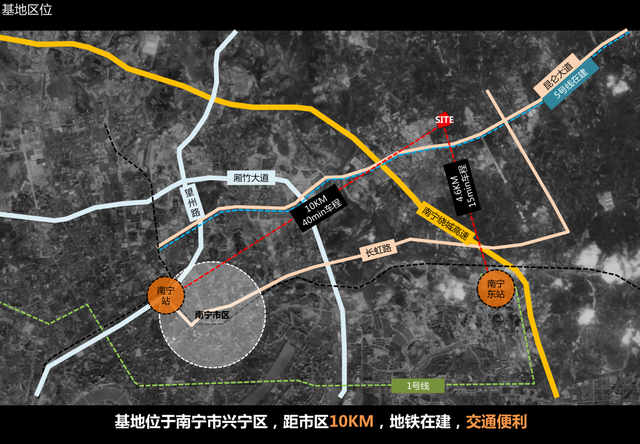 基地位于南宁市兴宁区,距市区10KM,地铁在建,交通便利。周边产业待发展,现状无豪宅气息,未来发展潜力大。未来周边旅游景观资源丰富,环境优美。