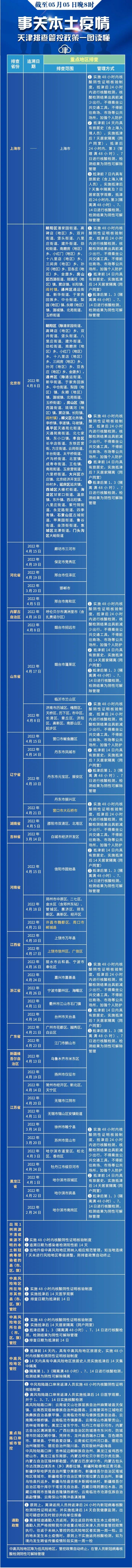 记者2022年5月5日从天津市疫情防控指挥部获悉,目前疫情形势严峻复杂,为科学精准严防疫情反弹,天津市疫情防控指挥部再次更新近期区域排查管控范围,涉及的相关人员主动向社区、工作单位等报备。