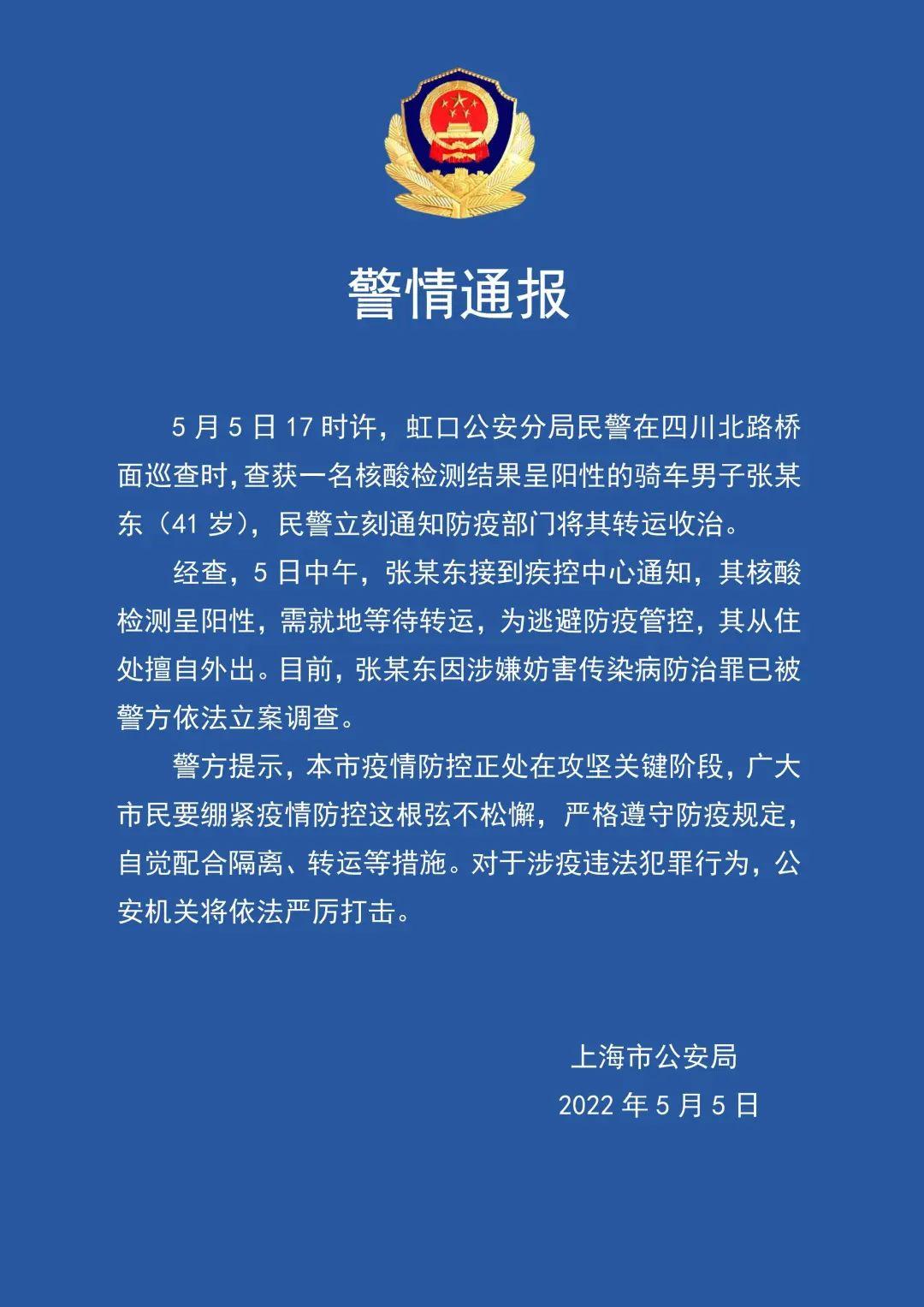 5月5日17时许,上海虹口公安分局民警在四川北路桥面巡查时,查获一名核酸检测结果呈阳性的骑车男子张某东(41岁),民警立刻通知防疫部门将其转运收治。
