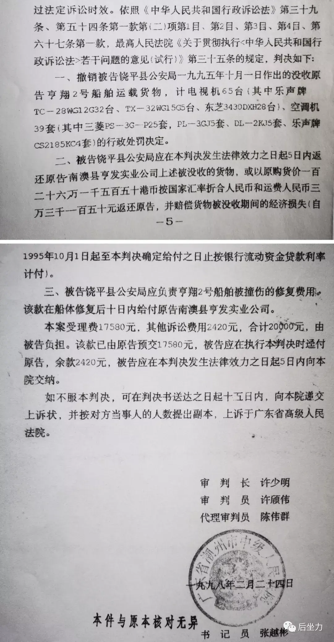 1998年2月,潮州市中级人民法院以(1997)潮行初字第1号行政判决书,依法作出判决: