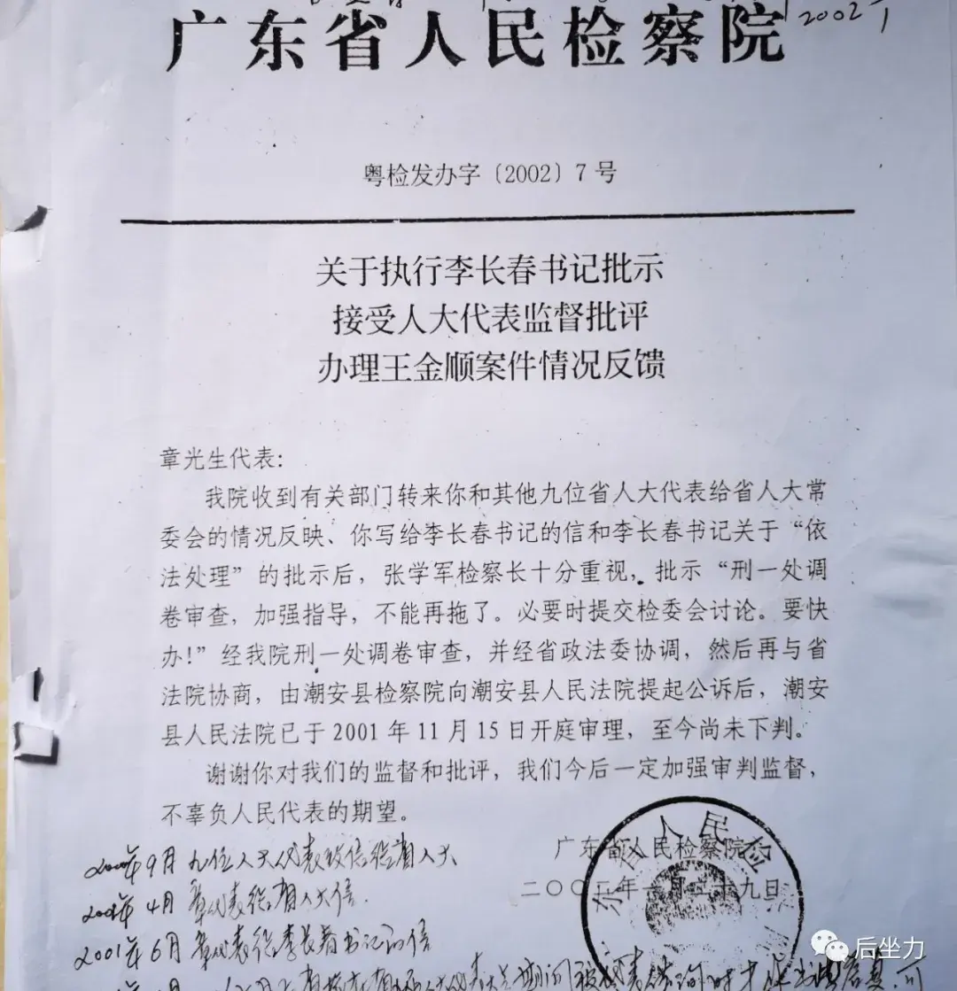 就在林壮森落马的同时,王金顺也收到了潮州市潮安区人民检察院的回复函,称其反映案件材料符合受理条件,已依法受理。