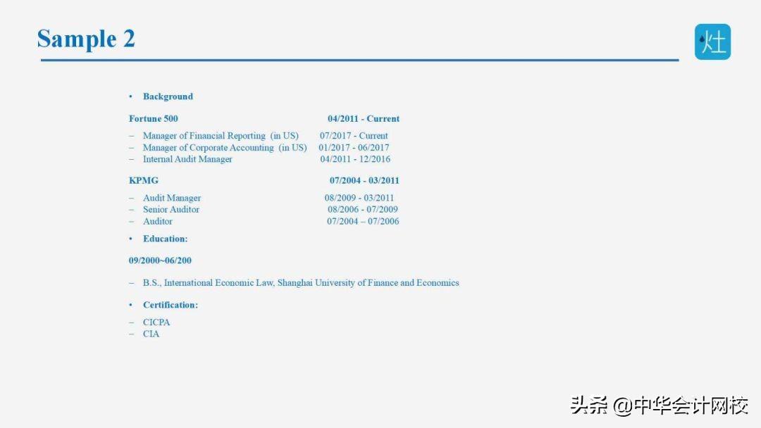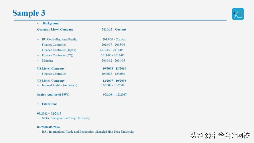 接下来通过三份代表性简历,来看一下四大背景的人在世界500强中的典型发展路径,大家可以作为参考。