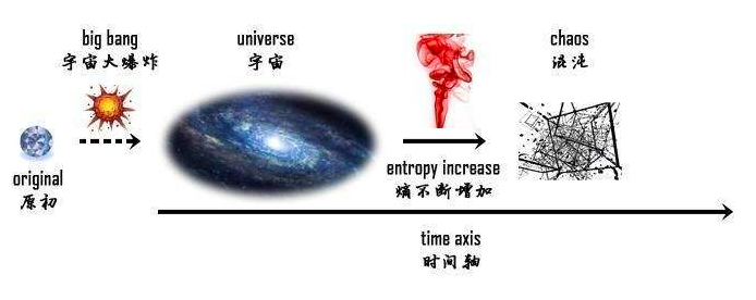 那如果宇宙呢?如果宇宙是一个封闭系统的话,我们不断在消耗着能量,且不可逆,熵不断在增加正在走向它的最大值,因此宇宙一旦到达热动平衡状态,就完全死亡。这种情景称为“热寂”,这样的宇宙中再也没有任何可以维持运动或是生命的能量存在。
