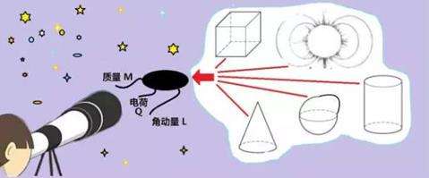 惠勒当时提出了著名的“黑洞无毛定理”。这个定理是对经典黑洞简单性的叙述,它说的是,无论什么样的天体,一旦塌缩成为黑洞,几乎不保持形成它的物质所具有的任何复杂性质。它对前身物质的形状或成分都没有记忆,它就只剩下电荷、质量和角动量三个最基本的性质。质量M产生黑洞的视界;角动量L是旋转黑洞的特征,在其周围空间产生涡旋;电荷Q在黑洞周围发射出电力线,这三个物理守恒量唯一地确定了黑洞的性质。因此,也有人将此定理戏称为“黑洞三毛定理”。(毛发是形象地比喻黑洞就是光溜溜一个天体,没有任何复杂性质)