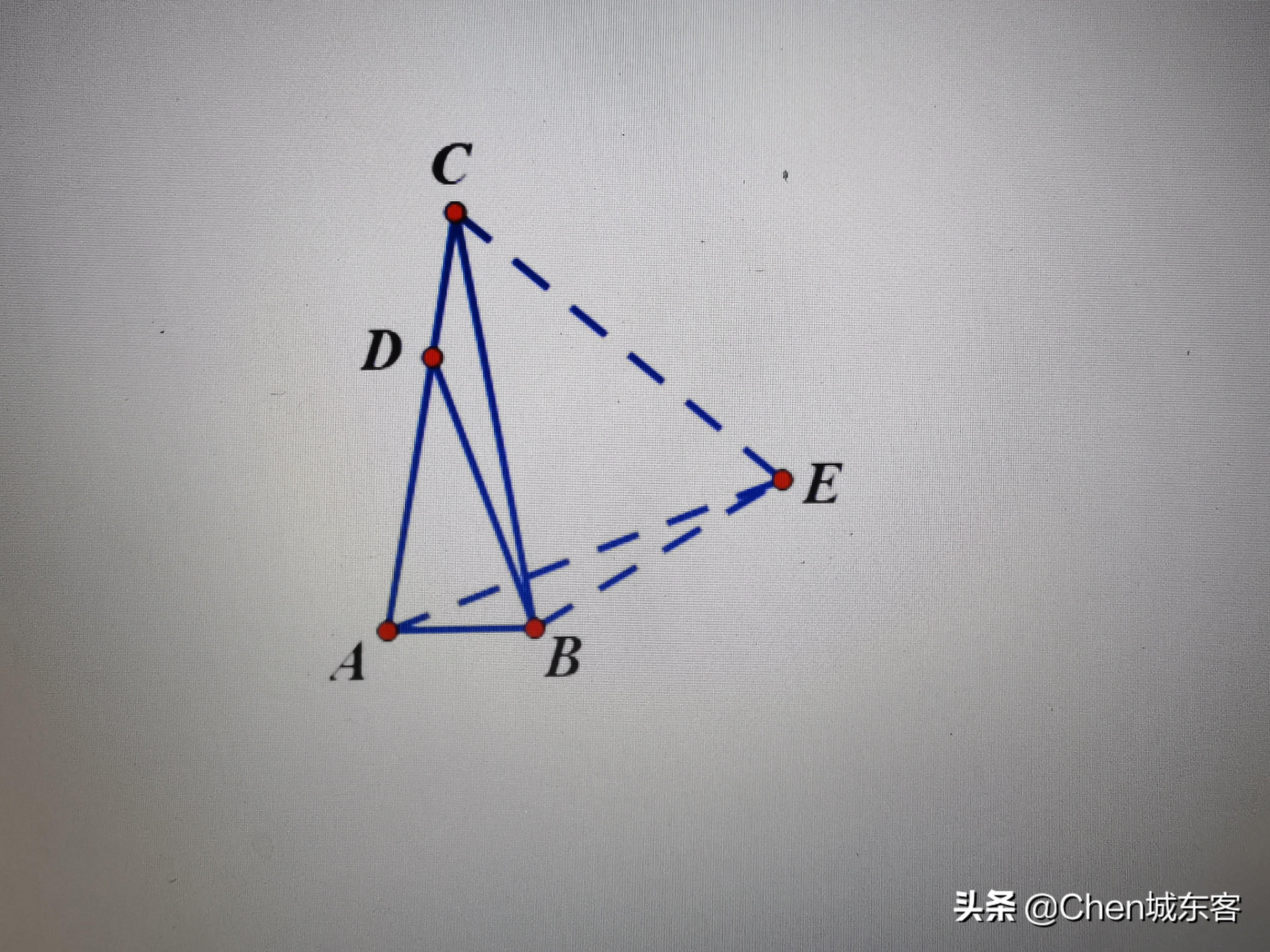 当然点A绕着点C逆向旋转60度到点E,也是同样的构造过程,创造了等边三角形ACE。在证明两个三角形BCD与EAB的全等,也是利用“角边角”的判定方法。