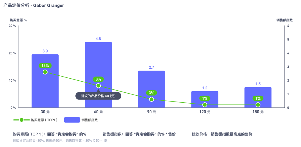 调查中为了消除价格出示顺序对消费者心理的影响,一半消费者会由高到底询问不同价格点的购买意向,一半消费者由低到高询问不同价格点的购买意向,最终得到每个价格下“肯定或可能会购买”的百分比和对应的销售额指数曲线。销售额指数最高点对应价格,即合适的定价。