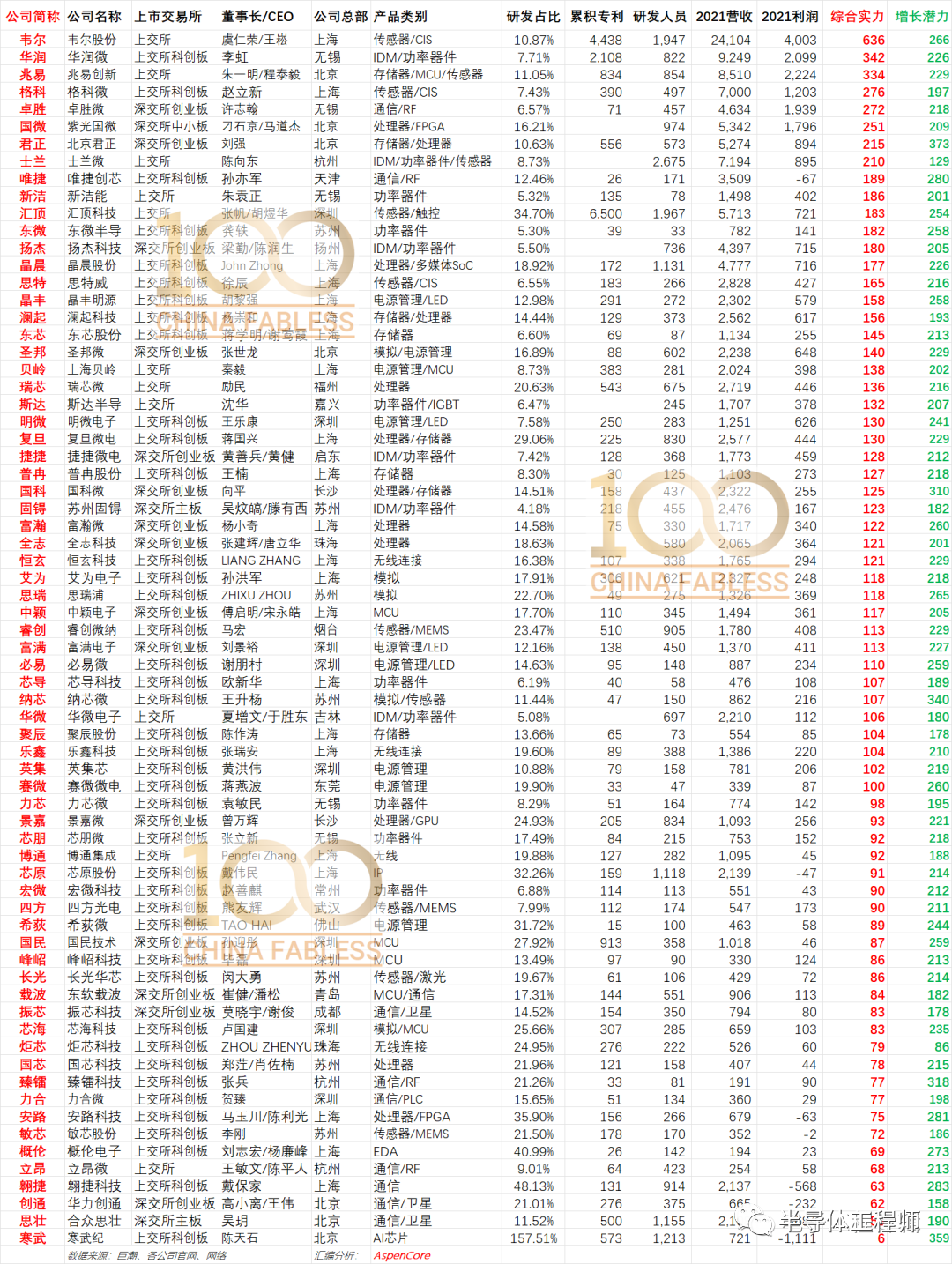 70家IC设计上市公司2021财年基本信息及综合实力和增长潜力指数汇总如下表。