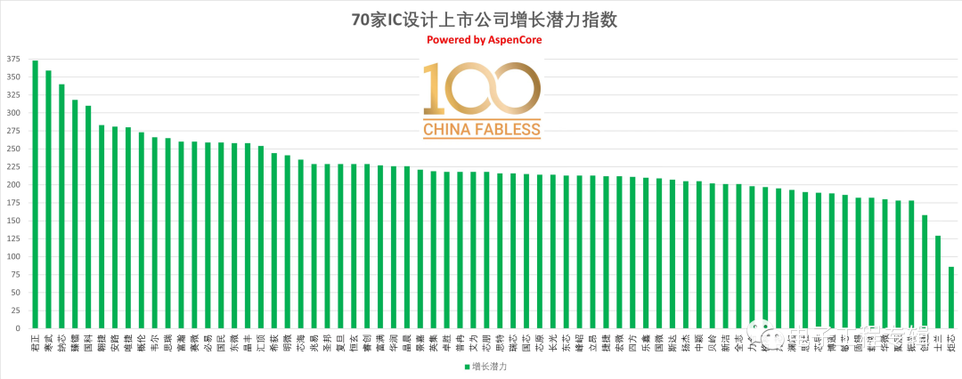 增长潜力Top 10:北京君正(373)、寒武纪(359)、纳芯微(340)、臻镭科技(318)、国科微(310)、翱捷科技(283)、安路科技(281)、唯捷创芯(280)、概伦电子(273)、韦尔股份(266)。