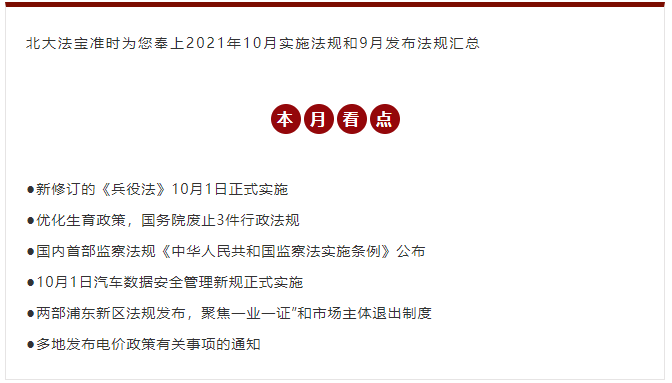 北大法宝准时为您奉上2021年10月实施法规和9月发布法规汇总