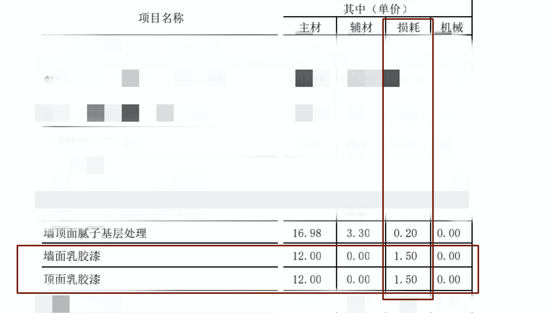 我们看到每个房间的乳胶漆工程,都有一个损耗的价格项,虽然费用不多,但乳胶漆损耗是真的想不通,乳胶漆怎么会有损耗呢?这个损耗是要怎么算?