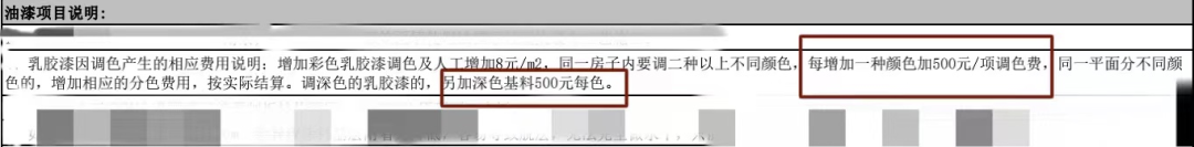 报价单上标明:每增加一种颜色+500元调色费,调深色乳胶漆,每个颜色还要另加深色基料500元。