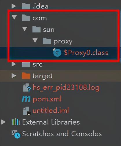 System.getProperties().put("sun.misc.ProxyGenerator.saveGeneratedFiles","true");2)然后运行程序,就会自动在当前项目下生成我们的代理类的.class文件了,文件相对路径是:com/sun/proxy/$Proxy0.class