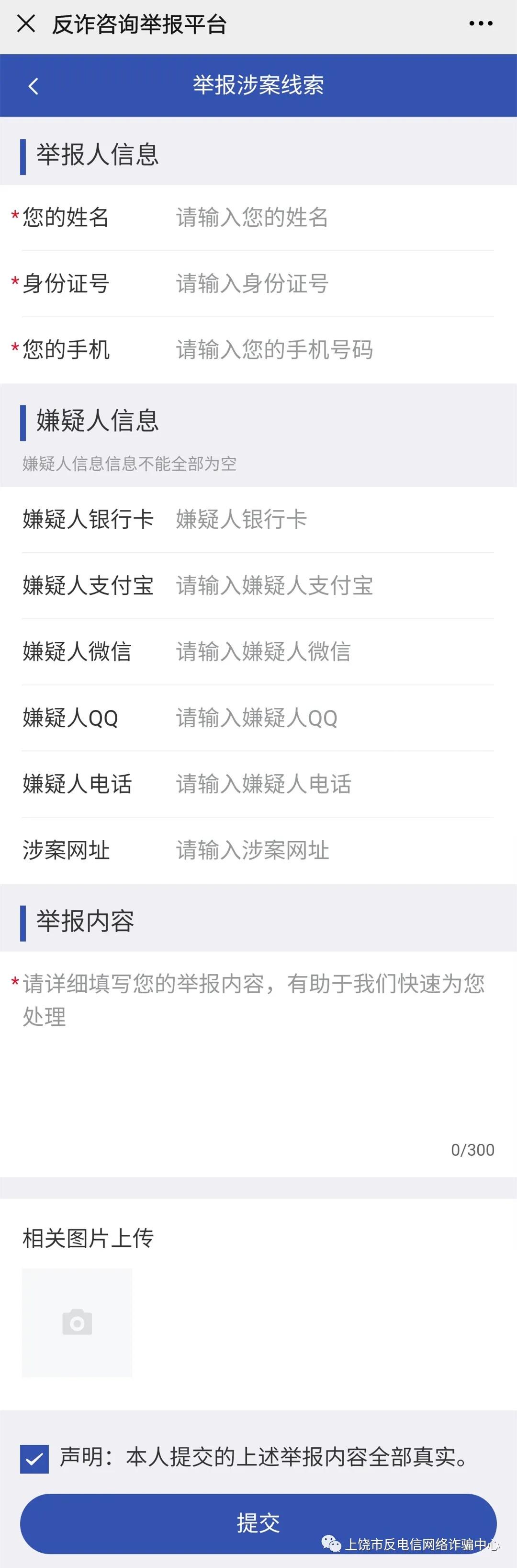 6、“我要举报”属于举报项,通过填报相关文字或图片,可以举报涉案线索和涉案人员。