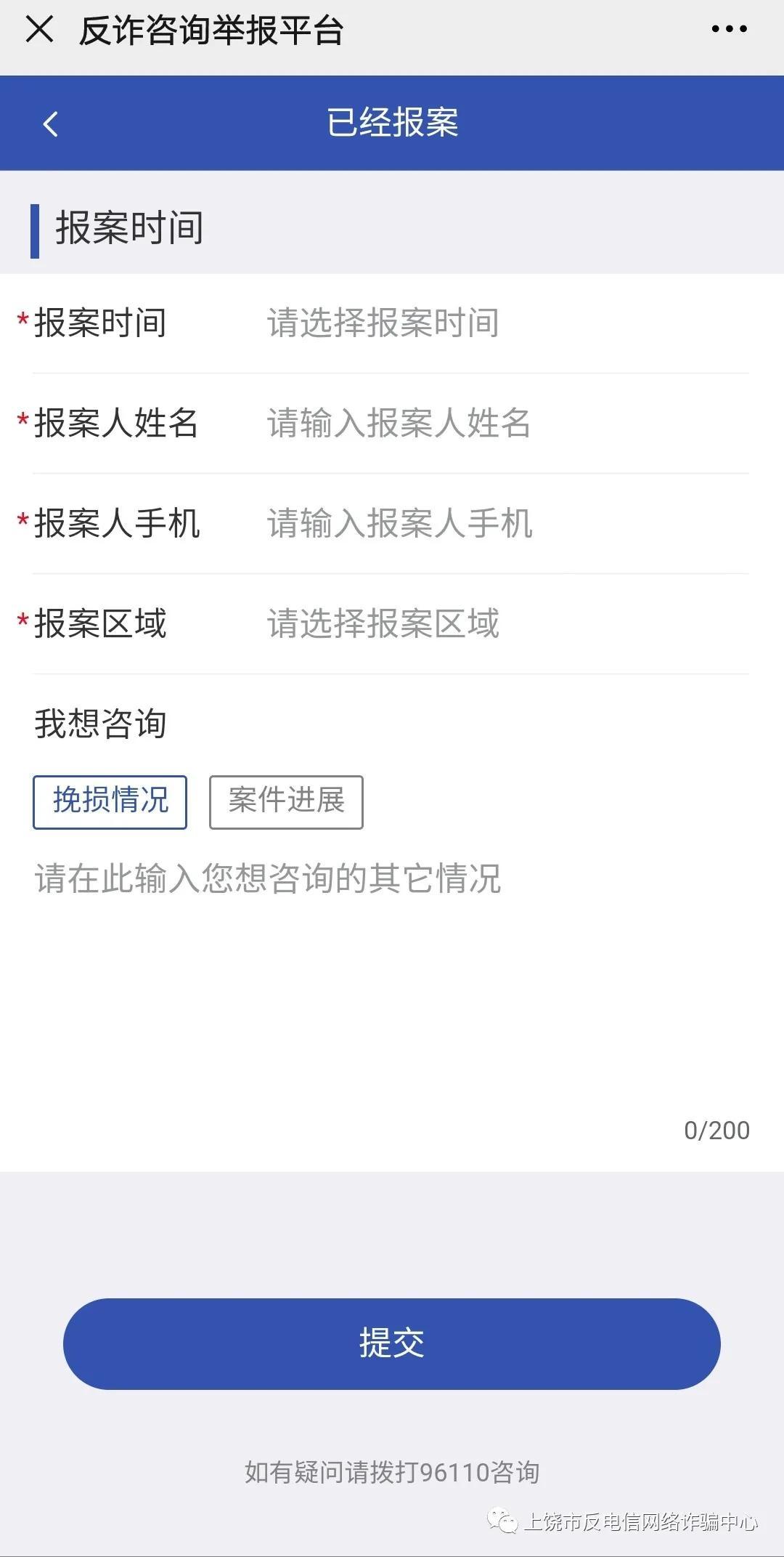 5、“我被骗了”属于咨询项,填写相关报案信息后,可以提交“挽损情况”“案件进展”等查询内容。如未报案,直接提示拨打110报警。