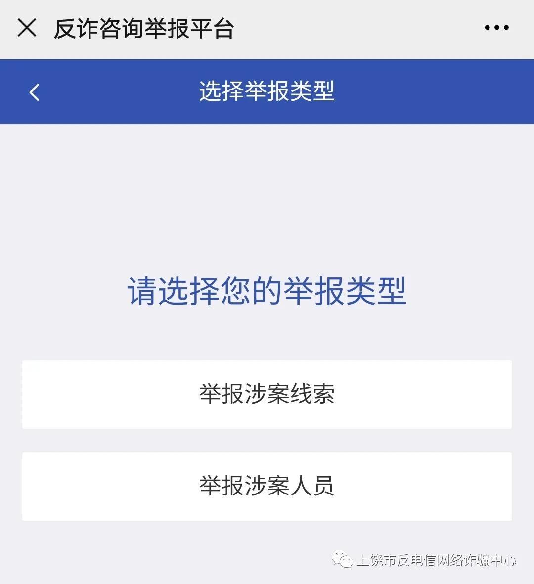 1、关注“上饶市反电信网络诈骗中心”公众号,点击底部左下角菜单“咨询举报”。