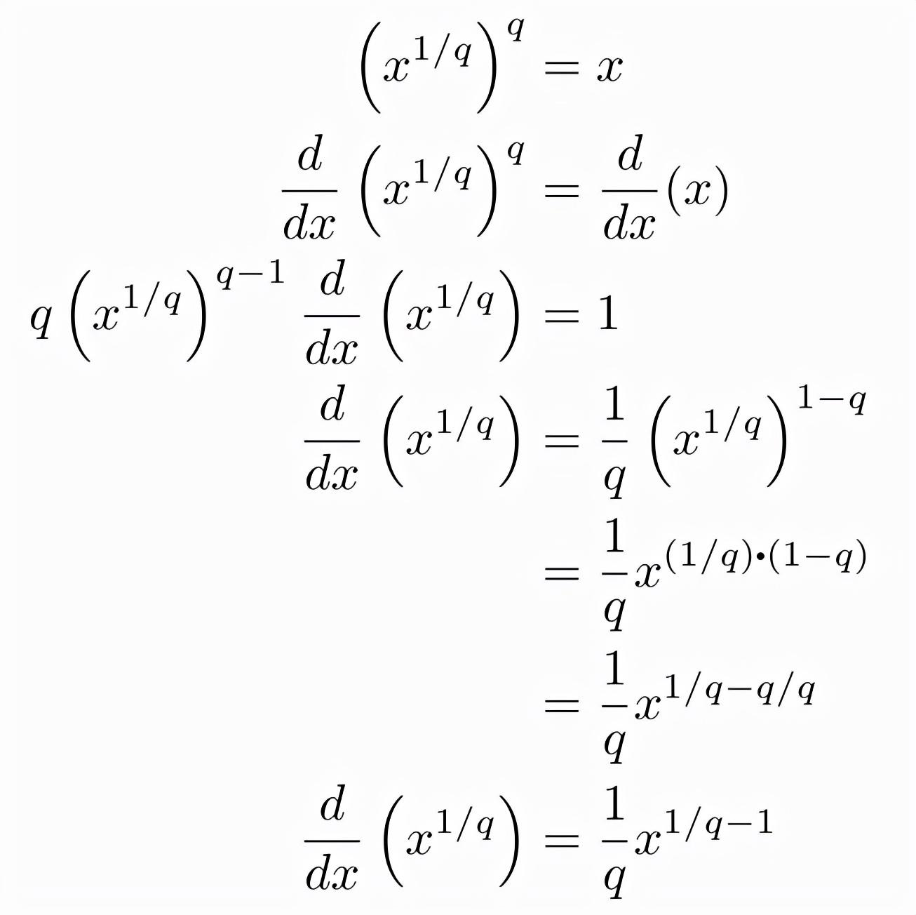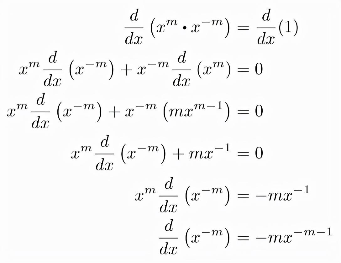 没有人会试图在一个函数不存在的地方取它的导数,所以我们只关心函数存在的地方的导数。在n为负整数的情况下,我们将遵循同样的过程。取两边的导数,使用链式法则,并求出导数: