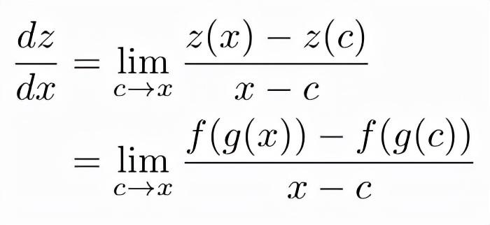 你可能意识到,当c接近x时,g(c)接近g(x)。如果你看过一些函数中的函数的导数的例子,你可能会注意到一个规律(试着求(x + c)^3或(x^2+ c)^2的导数,然后提出(x + c)或(x²+ c))。 你可能会想到,取外函数相对于内函数的导数,这看起来像: