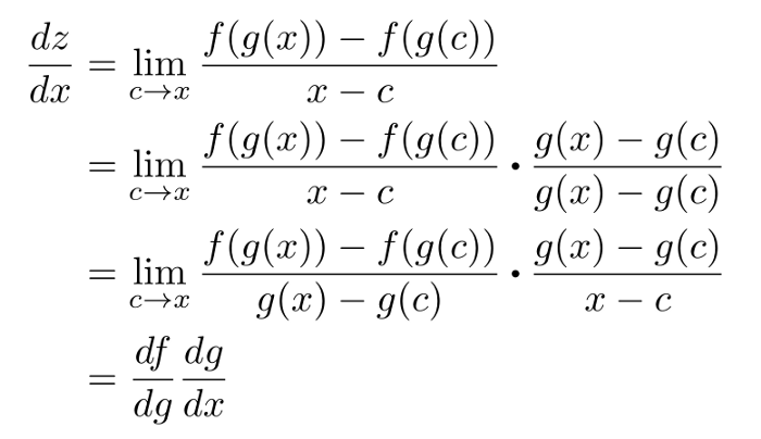 我们在x附近使用一个a,使g(a)=g(c),那么我们实际上没有乘以1,而是0/0(这是没有定义的)。对于我们所做的,这个链式法则的证明仍然有效因为只有当a = c时g(a) = g(c)。如果试图在x=0处求一个类似sin( 1/x )的函数的导数,你会发现一个问题,因为你永远无法在x=0周围找到一个区域,函数在这整个区域内都是有定义的。为了绕过这个限制,你可以通过解析延拓来堵住这些漏洞。在这个证明中,这对我们来说并不重要,所以我将继续往下。