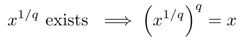 我们将使用一个类似于证明n<0的方法。例如,我们知道如果对一个数求第q次方根,然后取它的第q次幂,就会得到开始时的数字。在数学中,这个表述是这样的: