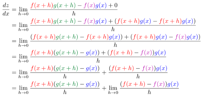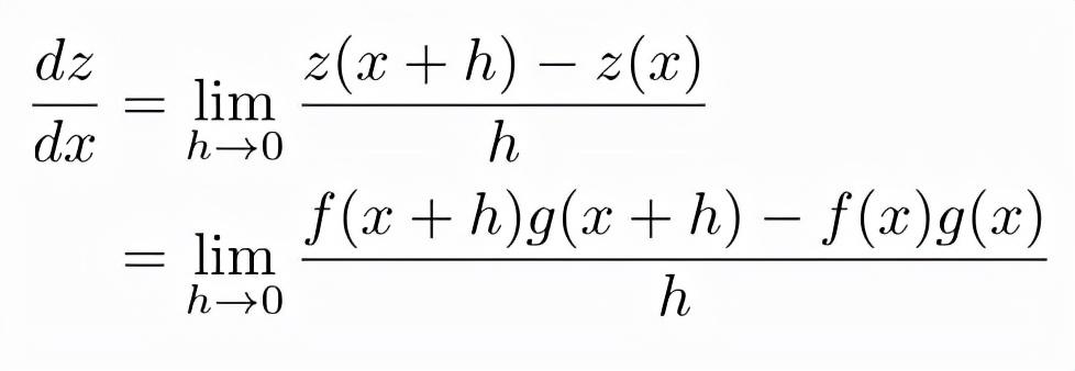 我们要从导数的定义来证明积法则。首先,定义一个函数z(x)=f(x)g(x)。然后,z相对于x的导数。由于我们谈论的是任意函数,我们必须使用导数的定义。
