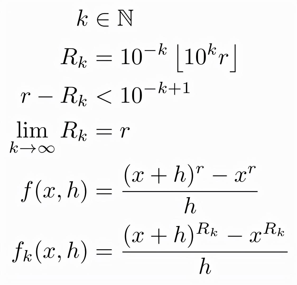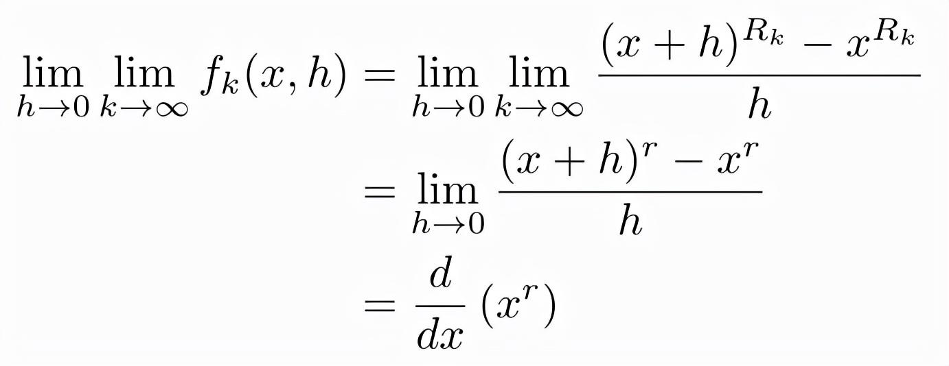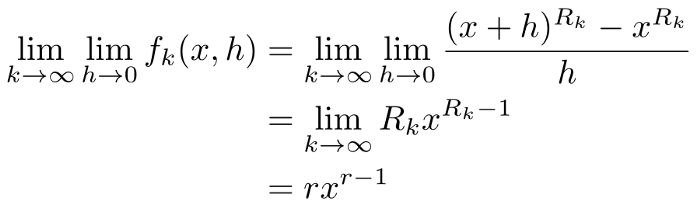 只关注x^r,因为在同一域上一致收敛的两个函数的和或差也会在同一域上收敛。首先,选择你要取导数的x。我们把它叫做c。选择一个小的h,使0不在(c-2h,c+2h)内。在0处,极限可能不存在无理数,所以我们并不关心。让域是(c - 2h, c + 2h)。由于x^r对于所有有限的r来说在有限域上是有限的,所以x^r和x^Rk之间的差值,对于域中的每一点也是有限的。既然每一点的差值都是有限的,那么这个差值一定有一个最小的上界。由于这个差值在每一点上都趋于零,所以最小上限也必须减少到零。既然最小上限为零,那么在某一点上它一定小于你选择的任何ε。因此,我们已经证明x^Rk在相关区域内均匀地收敛于x^r。因为fk是x^Rk在定义域内两点之差除以一个非零常数,所以k的极限也是一致收敛的。所有无理数