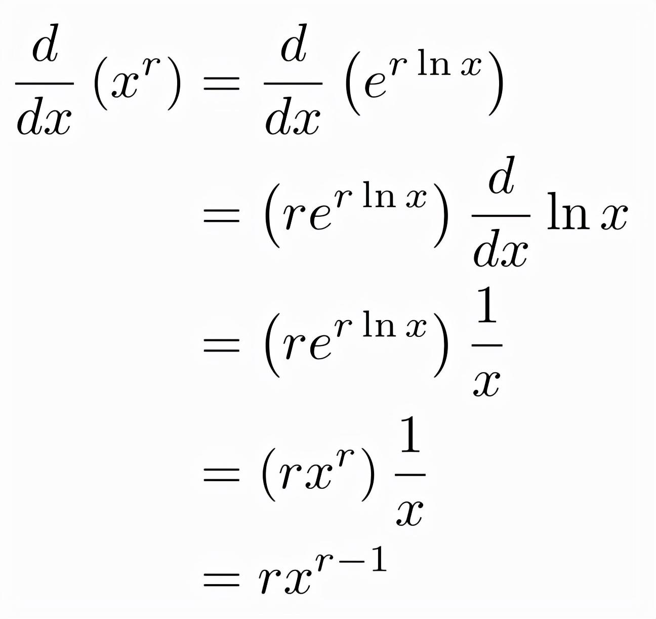 如果我们愿意,我们可以根据e^x、ln x的定义和链式法则计算这些导数。无论哪种方式,最终都会从头证明幂法则。