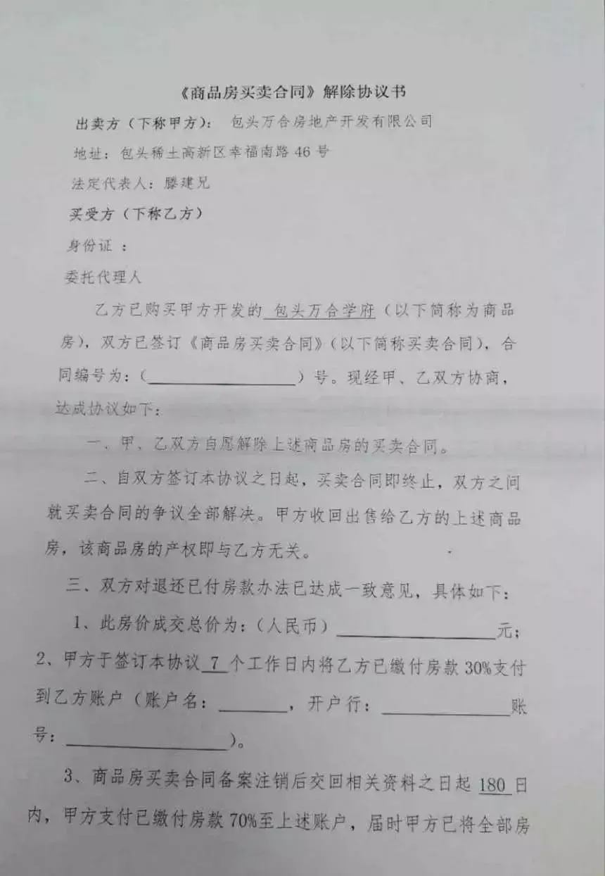好在近期事情出现转机,在社会舆论与资金回笼压力下,开发商给出退购房款的解决方案。中国房地产报记者在开发商出具的一份《商品房买卖合同解除协议书》中看到,双方如果达成解除协议,开发商便在签订协议7天之内退还业主30%的购房款,剩余70%待商品房备案注销并交回相关材料后的180日内返还。