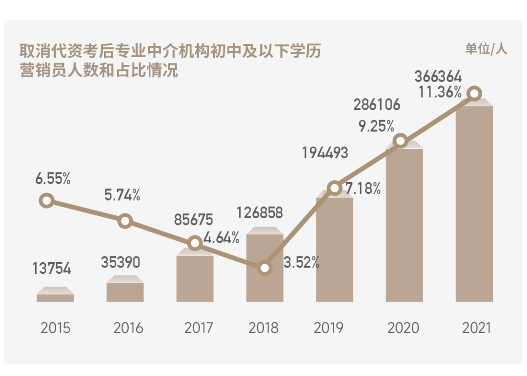 另据数据显示,取消代资考后,某省2016年营销队伍中,初中及以下学历人数达157972人,在营销员中的占比达到55.7%。