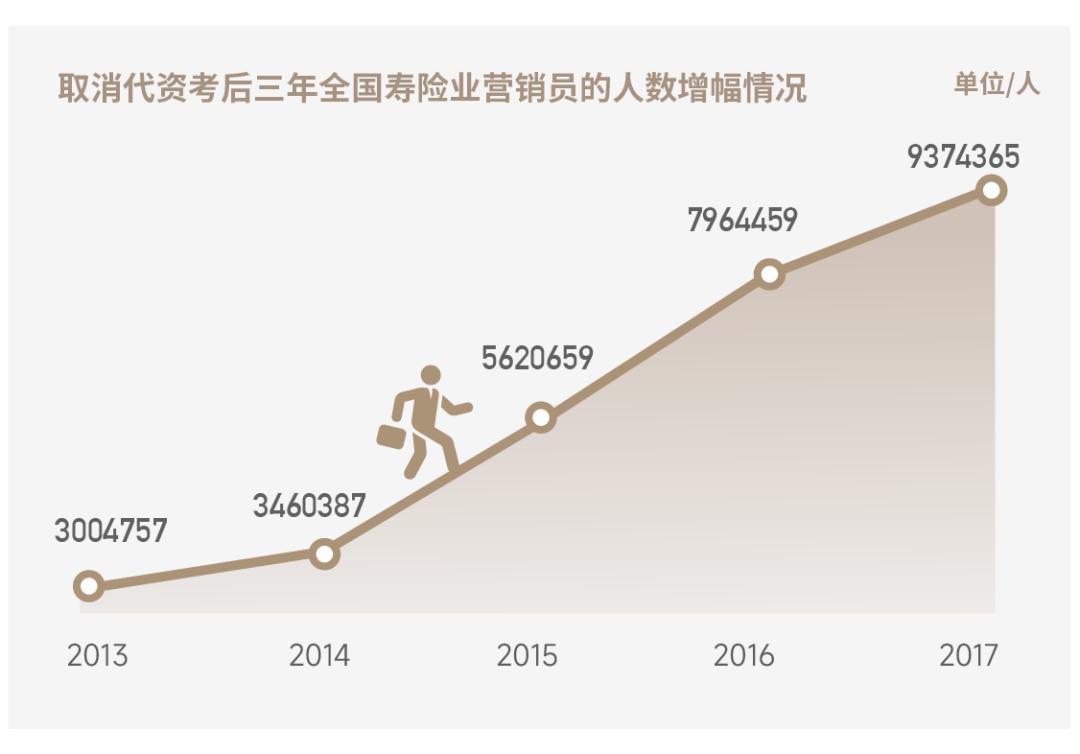 从上表可以看出,从1992年-2014年22年间,全国寿险业营销员总数为346.03万人,2015年取消代资考后,到2017年达到937万人,三年净增加591.39万人,三年净增加的人数是过往22年留成人数的2.7倍!