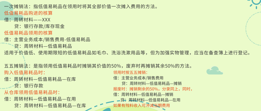 (1)对于不能作为固定资产管理,且单价较大,使用期相对较长的周转耗材,如床上用品,茶具器皿厨房用具、桌椅、锅碗瓢盆等,则按低值易耗品管理,采用五五摊销法。