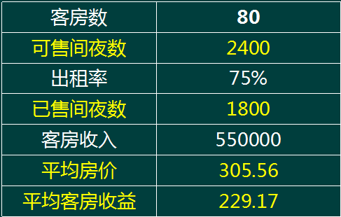 例:某酒店房间数80间,9月份出租率75%,客房收入55万元,请分别计算酒店可售间夜数、已售间夜数、平均房价、平均客房收益?