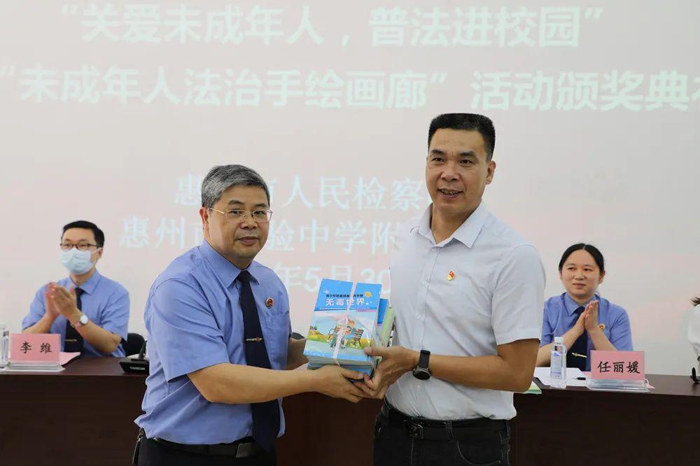 5月30日下午,市检察院“关爱未成年人,普法进校园”暨“未成年人法治手绘画廊”颁奖典礼在市实验中学附属学校举行。市检察院检察委员会专职委员黄炜均,市实验中学附属学校党支部书记、校长杨永强等领导出席本次活动。