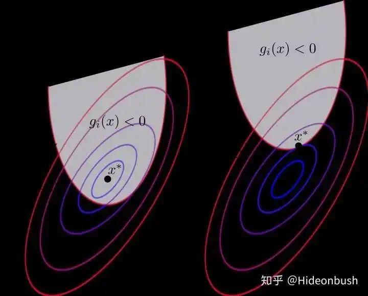 可行解在g(x)<0;可行解在g(x)=0。可行解在g(x)<0,就表示这个约束条件并没有起到约束效果,有跟没有是一个效果(下图中的左图);可行解g(x)=0,就表示这个约束条件起到作用了,这就表示g(x)与f(x)相切,也就是下图中右边的图。