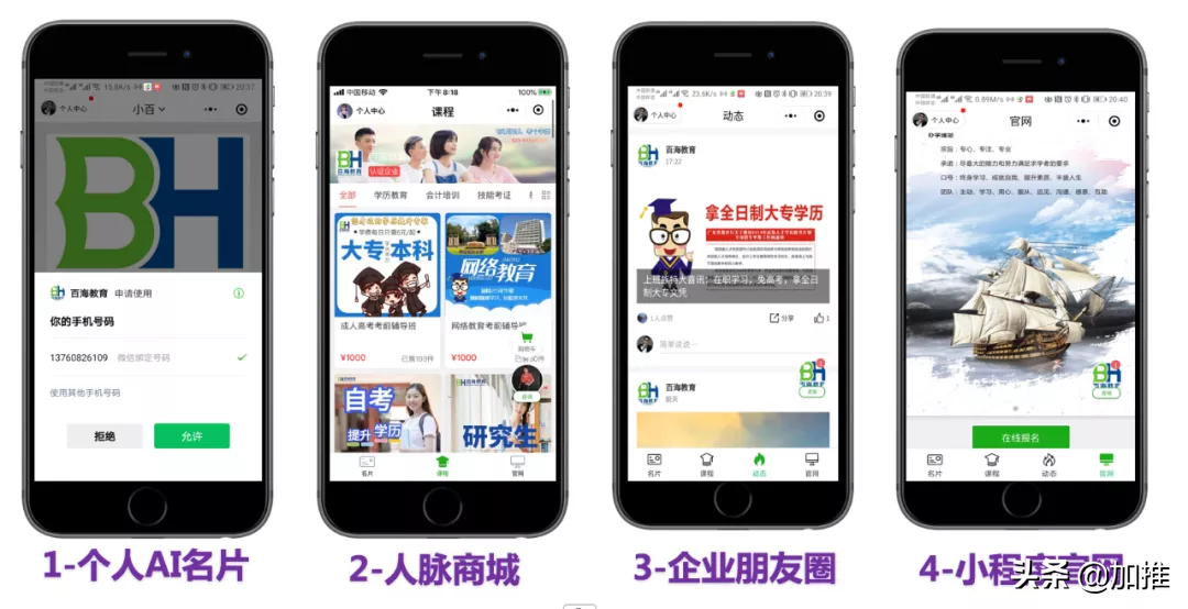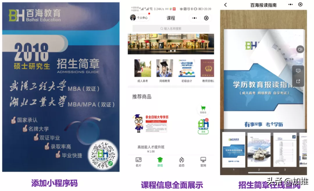 未使用加推之前,百海教育通过发传单模式介绍公司业务,里面的二维码进入微信公众号,用户难以留存。现在,他们只需要在传单上印上小程序码引导客户扫码就能查阅所有的课程信息。
