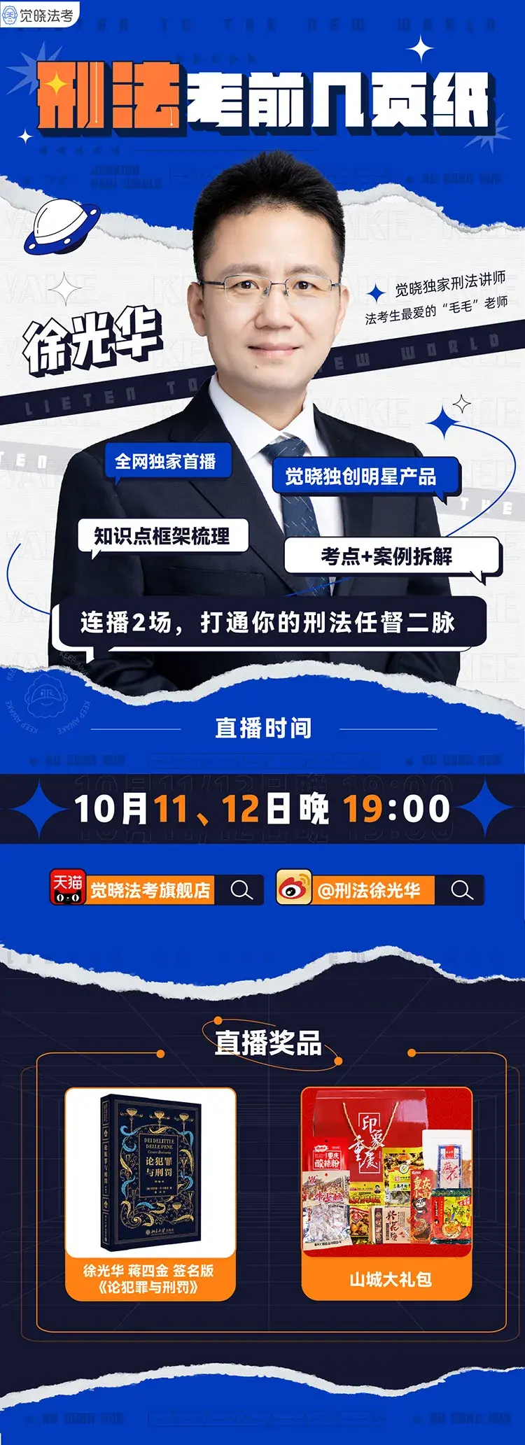 4.10月11日、12日每晚7点,徐老师会在【觉晓法考旗舰店】的天猫直播间用刑法的考前几页纸给大家串一遍,梳理知识点框架,拆解考点和案例,带大家在考前再稳一稳刑法!
