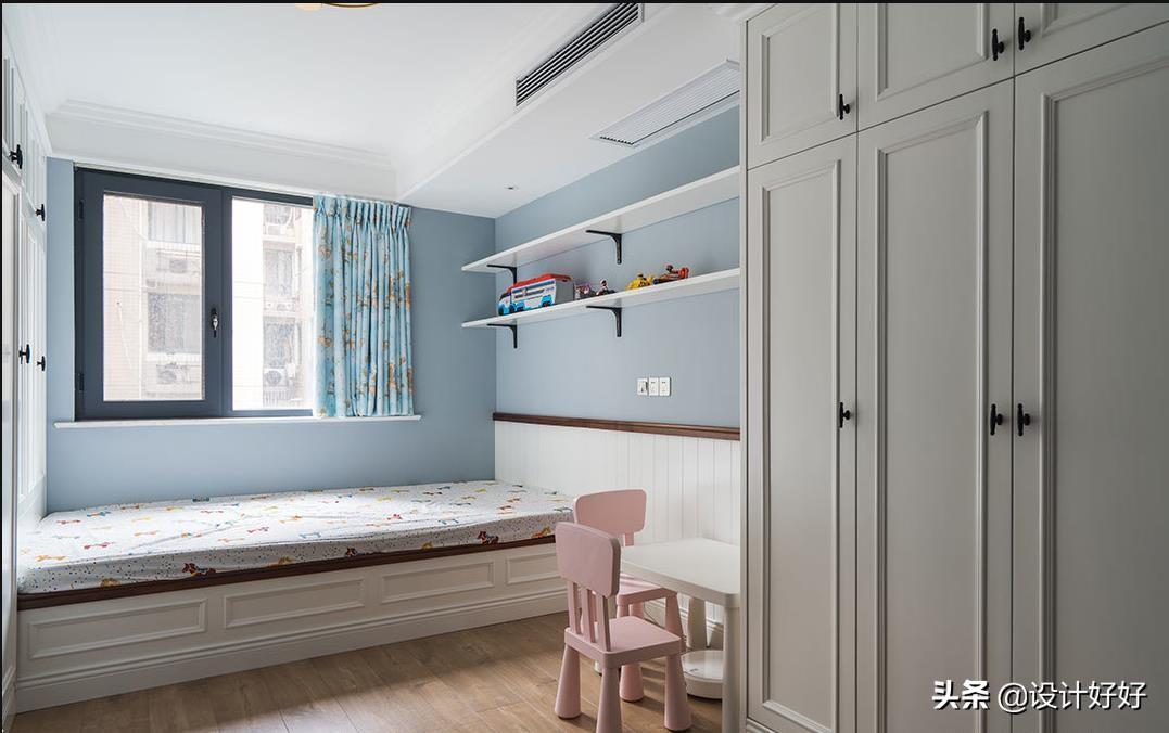 浅天蓝墙壁,搭配白色墙裙,白色床衣柜,粉色+白色小桌椅,灰色玩具柜,木色地板。童趣十足。天蓝色是一种比较明亮的颜色,虽然并不抢眼,但是它却给人一种宁静悠然的气息。