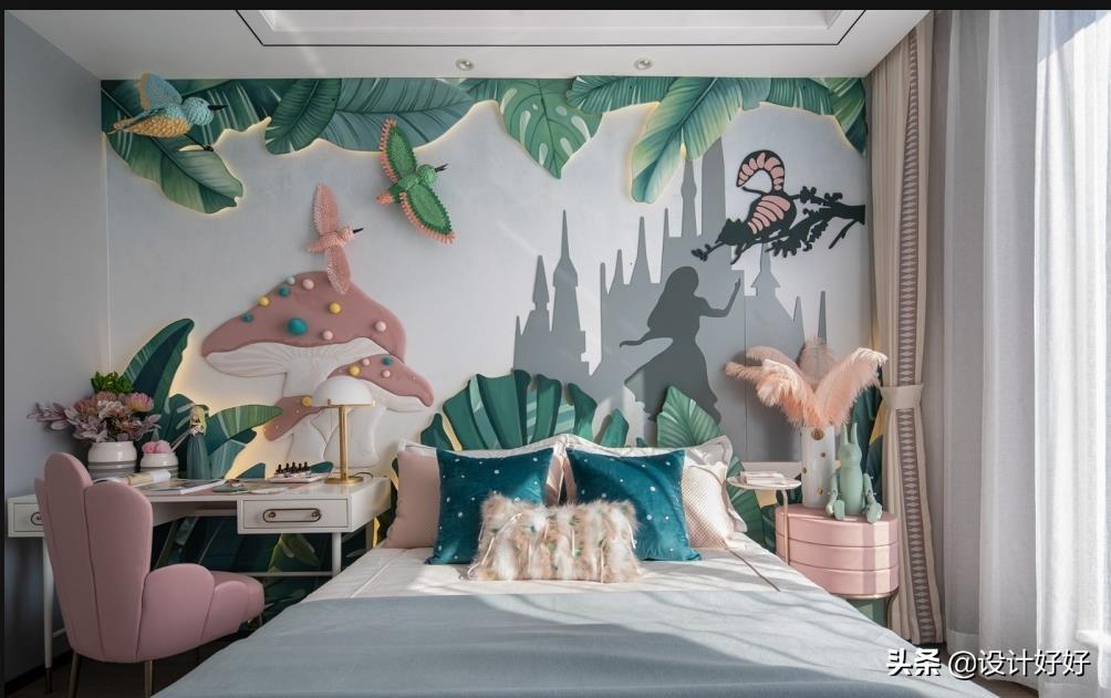 灰色墙面,搭配墙绘,灰姑娘,公主,城堡,每一个少女都有一个公主梦。浅灰色调,搭配绿色橄榄枝,棕榈,营造轻松活泼氛围。
