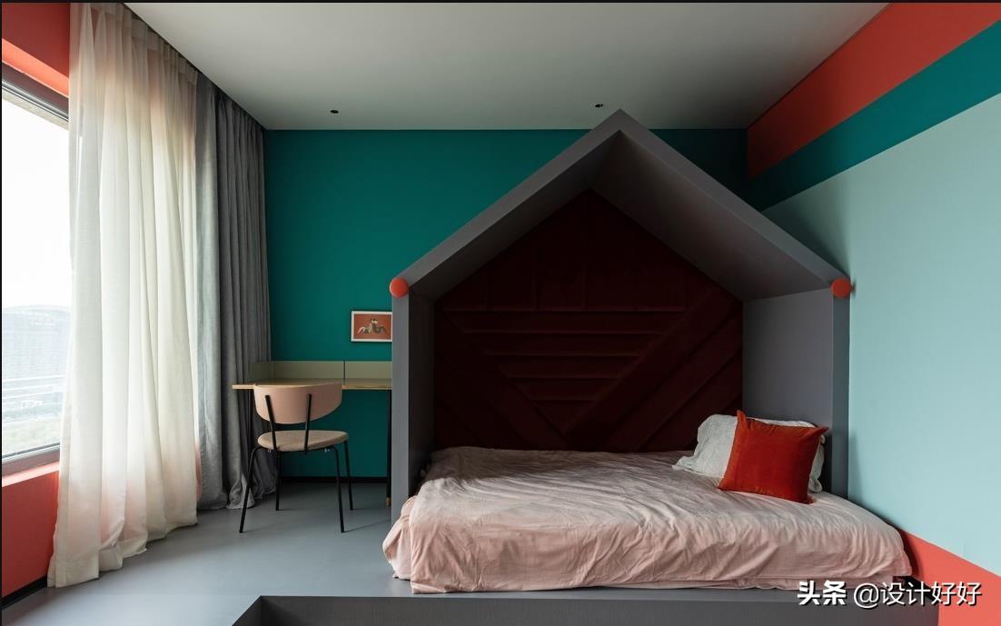 橙红色与青绿色搭配装饰墙面,活跃的墙面色彩,搭配灰色城堡床,灰色窗帘。灰色地台,营造彩色城堡。