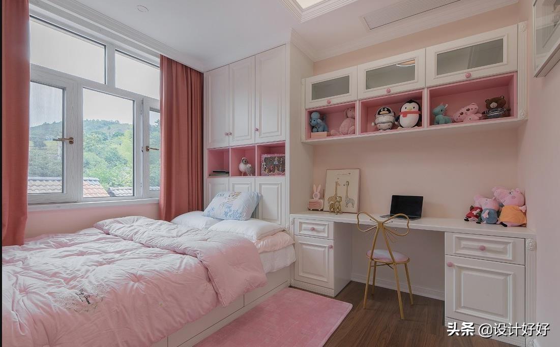 淡粉色壁纸,白色踢脚白色实木复合门,淡粉色衣柜,白色书桌。整体淡粉色为主,常规的女儿房。住在粉色装饰的房间中,有助于缓解精神压力,促进人的身心健康。疲惫的时候,看看粉色,就会很放松。喜欢淡粉色人不仅具有高贵典雅的气质,还很会照顾他人。