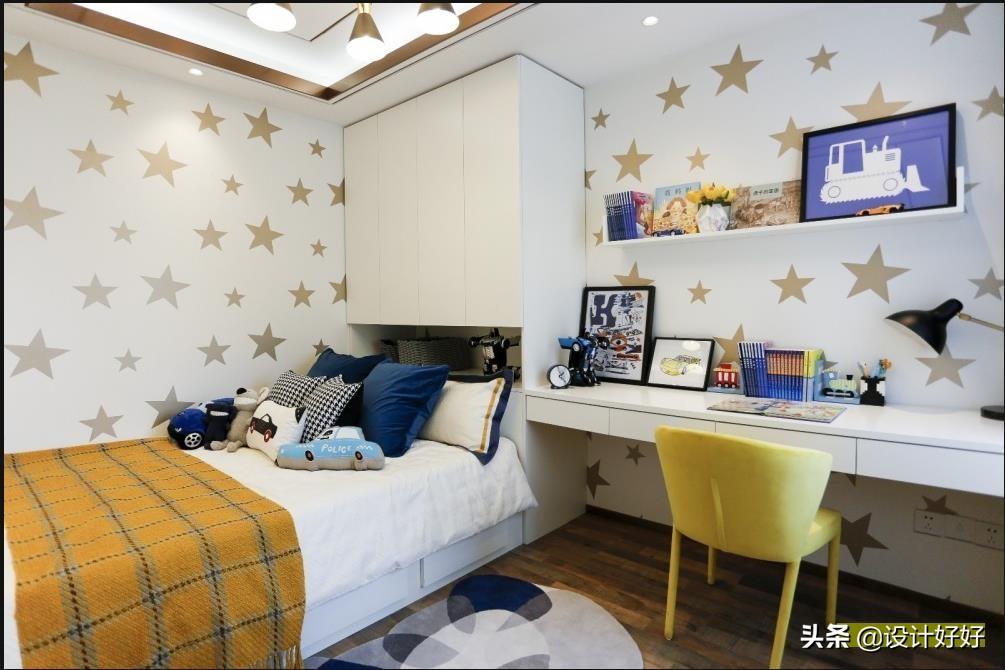 除了蓝色,黄色装饰男孩房也是不错的,黄色五角星壁纸,搭配白色,家具,黄色点缀,蓝色辅助,烘托活跃的氛围。黄蓝色对比温馨、舒心雅致,很容易让人产生联想。