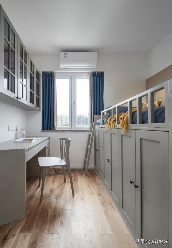 针对小面积儿童房,可以做高箱床,高度90厘米,上面做床,下面放置玩具。一侧做书桌衣柜。完美解决小孩玩具多收纳难的问题。