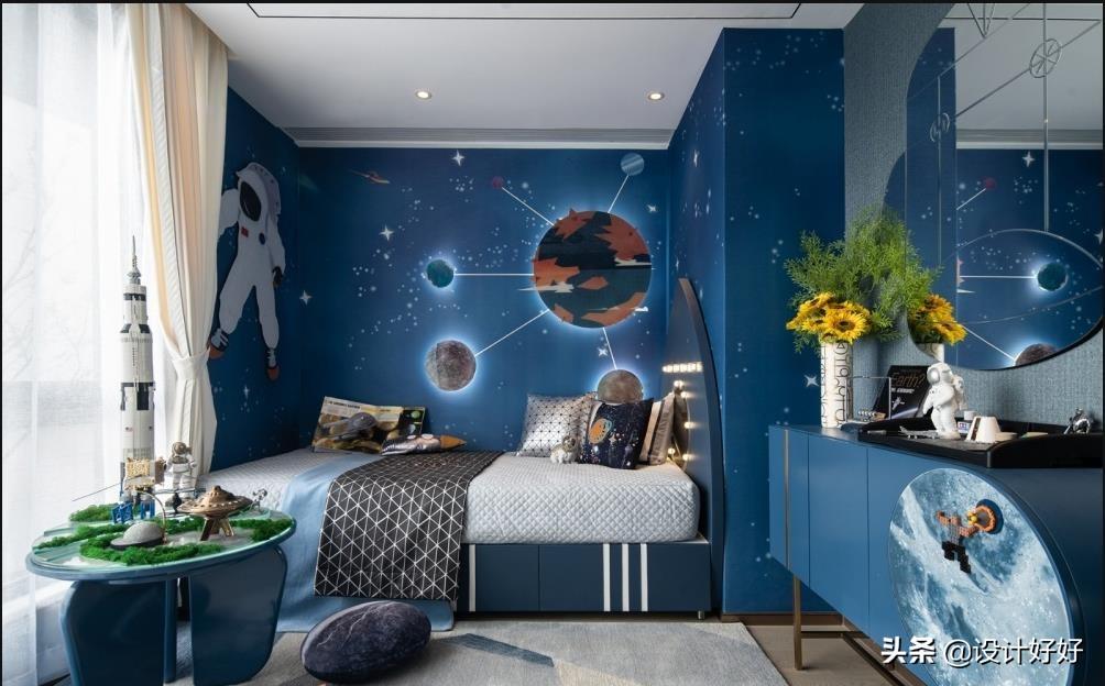 宇宙无极限,用星空主题装饰男孩房,搭配墙面镜子,定制星空主题家具,打造星空乐园,对于喜欢航空航天的小朋友再合适不过了。满满的星空乐园,童趣十足。