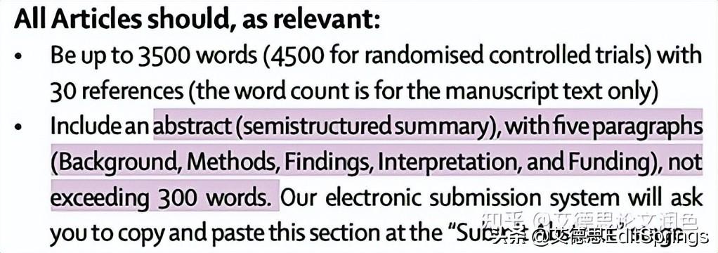 摘要不可引用文献;不要出现未定义的缩写;避免重复、冗长的描述;避免描述常规的实验细节;不要出现无结果支持的研究结论!根据不同期刊要求,摘要可分为结构化(structured)和非结构化(unstructured)摘要,一般字数250~300字不等。以《Lancet》杂志的摘要要求举例: