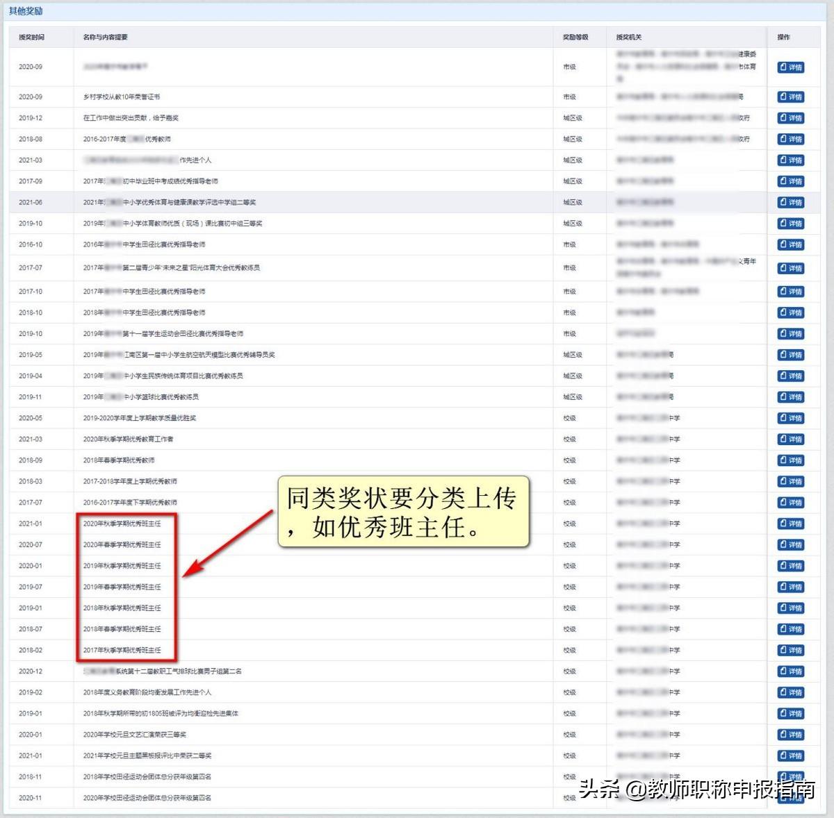 不按个人奖、单位奖分类。在详情中上传了照片。规范填写: