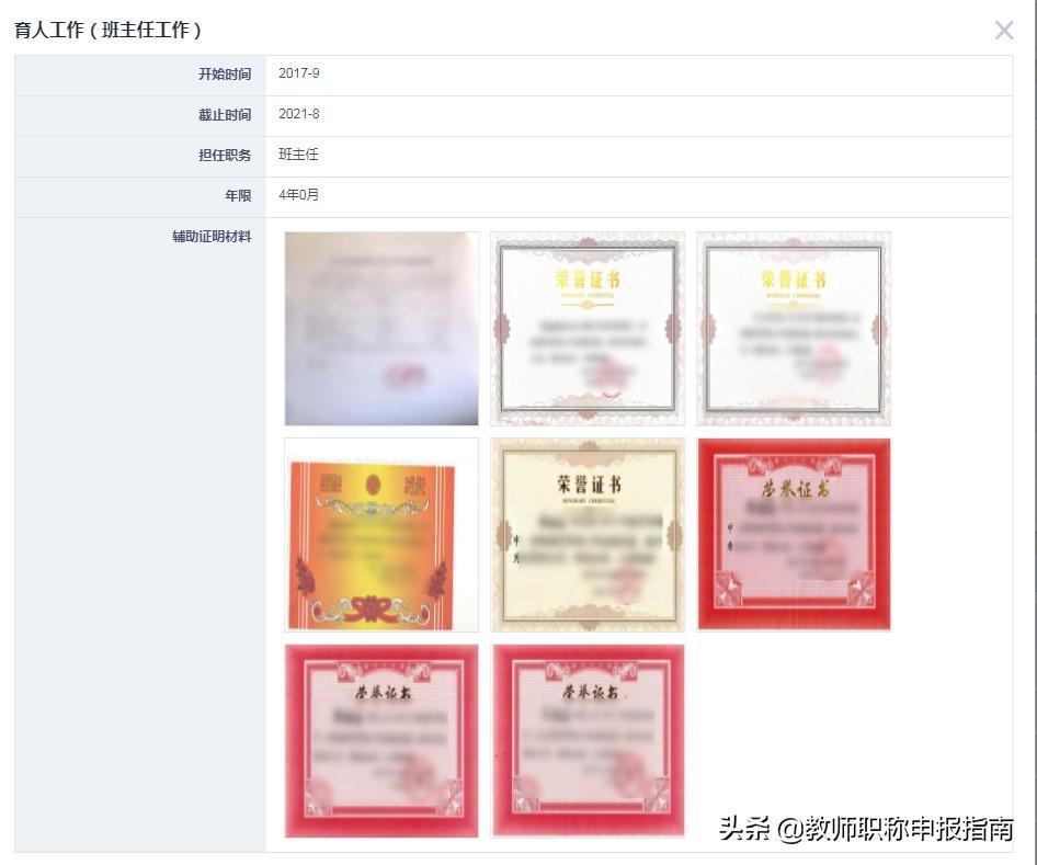 规范填写:系统只填写“任现职以来…”班主任年限,“班主任(德育)工作经历及减免认定表”扫描件上传在第一条信息处且只上传一次。