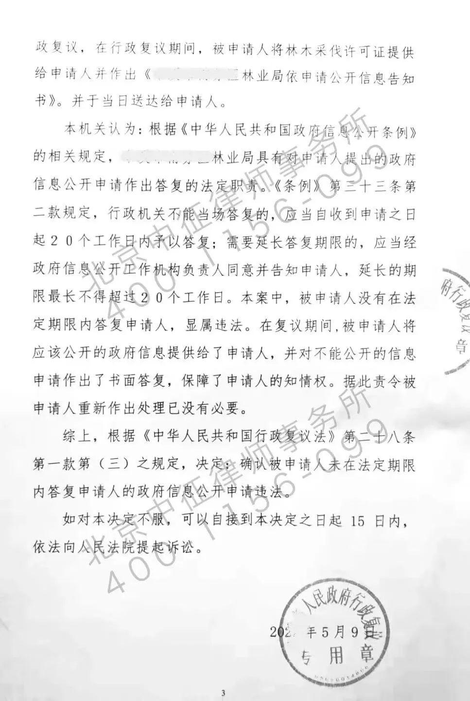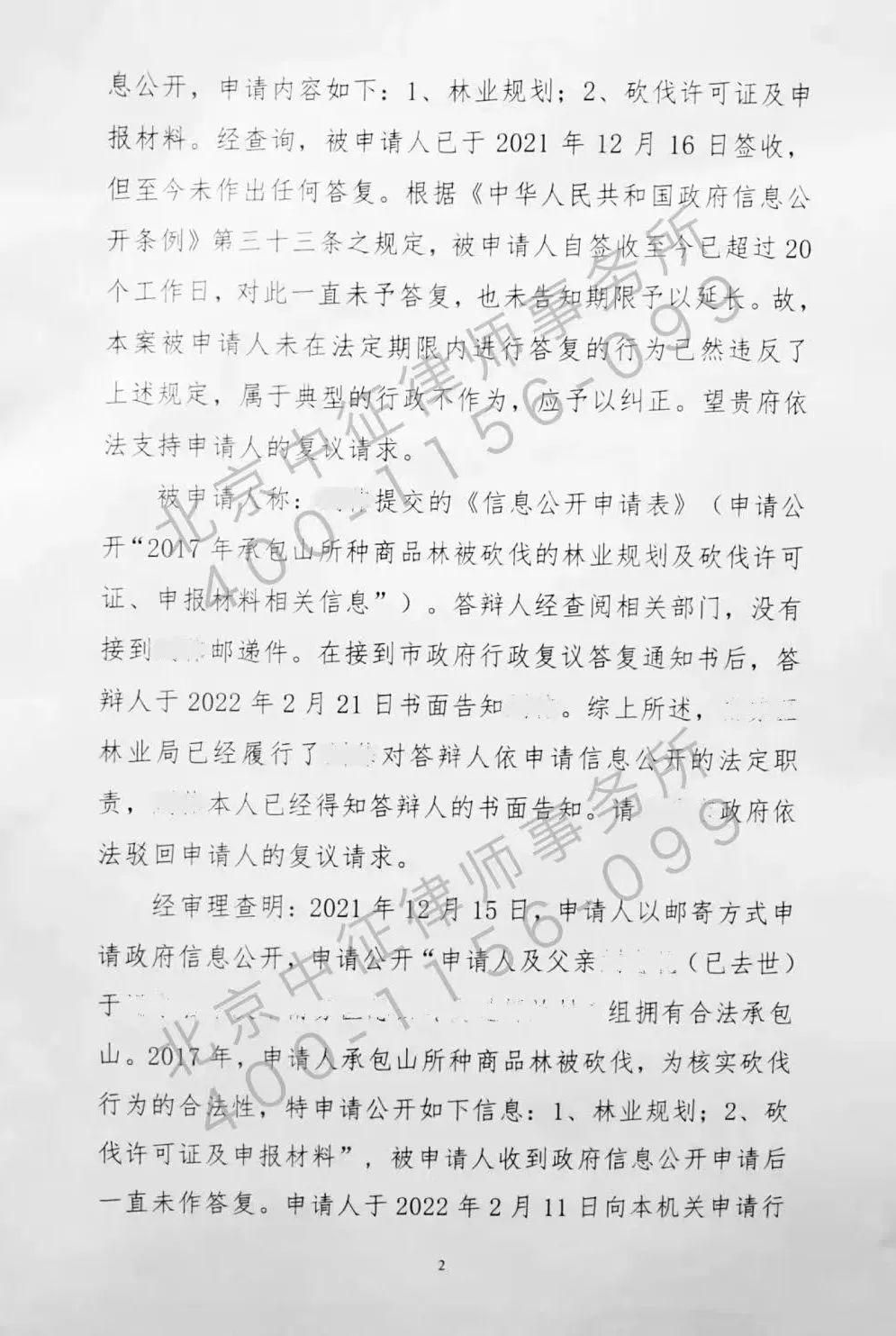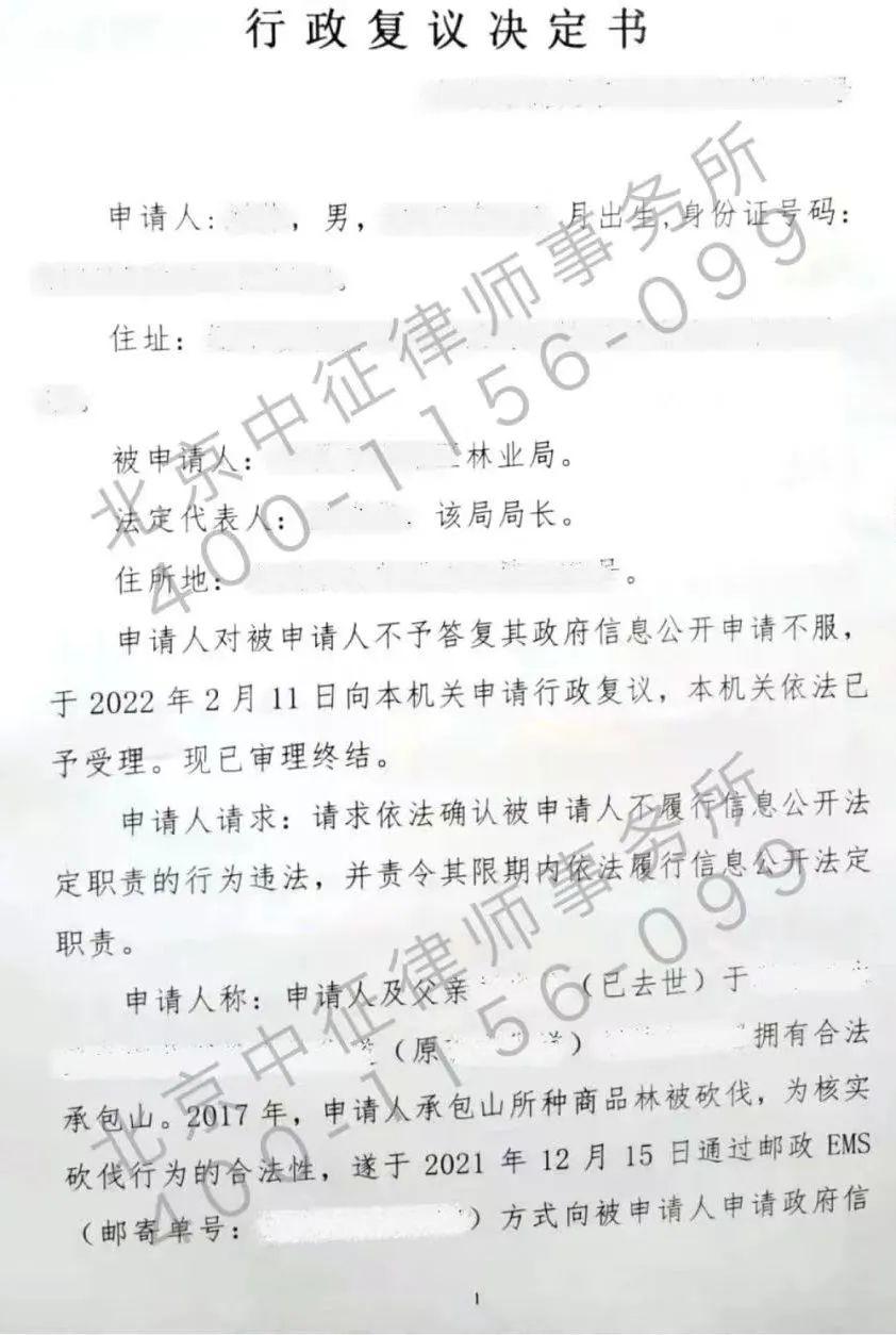 北京中征律师事务所在办理辽宁省本溪市刘先生承包山林木征收案件过程中,依法向区林业局申请信息公开,但区林业局在法定期限内未进行答复。委托人在中征律师的指导下,向本溪市人民政府提起行政复议。本溪市人民政府作出《行政复议决定书》,确认区林业局不履行信息公开职责违法,中征律师成功维护了委托人的合法权益!
