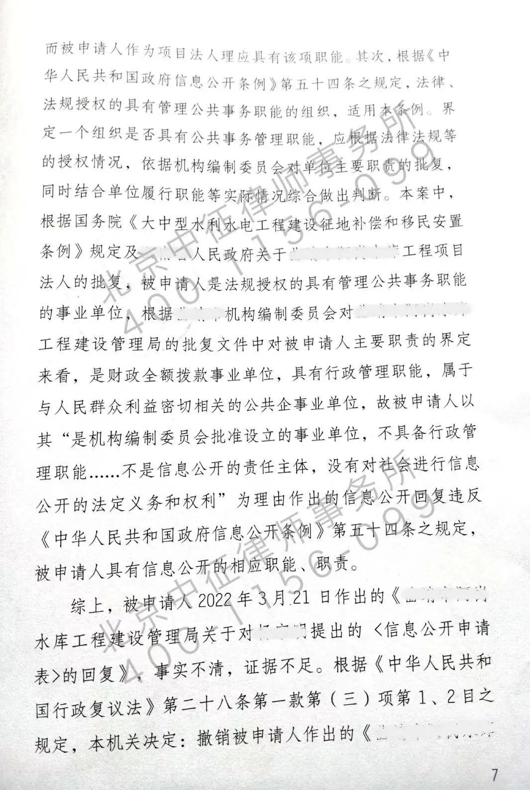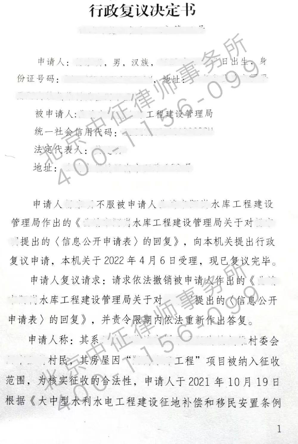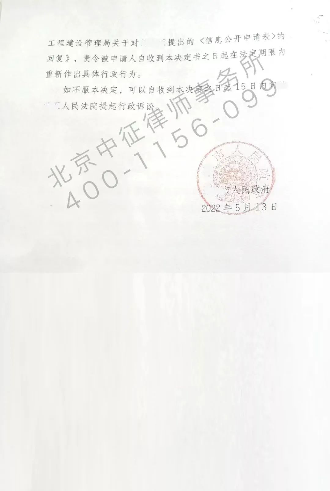 北京中征律师事务所在办理云南省曲靖市某村房屋征收案件过程中,依法向某工程建设管理局申请信息公开,该局未正确履行政府信息公开法定职责。委托人杨先生在中征律师的指导下,向市政府提起行政复议。市政府作出《行政复议决定书》,撤销该局作出的信息公开告知书,责令其重新作出处理。中征律师成功维护委托人合法权益!