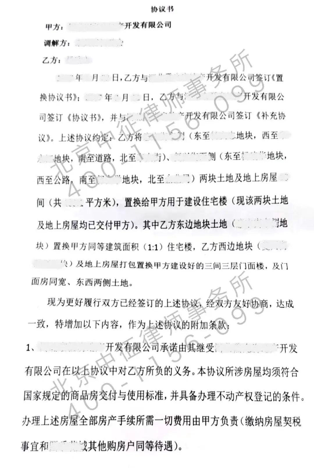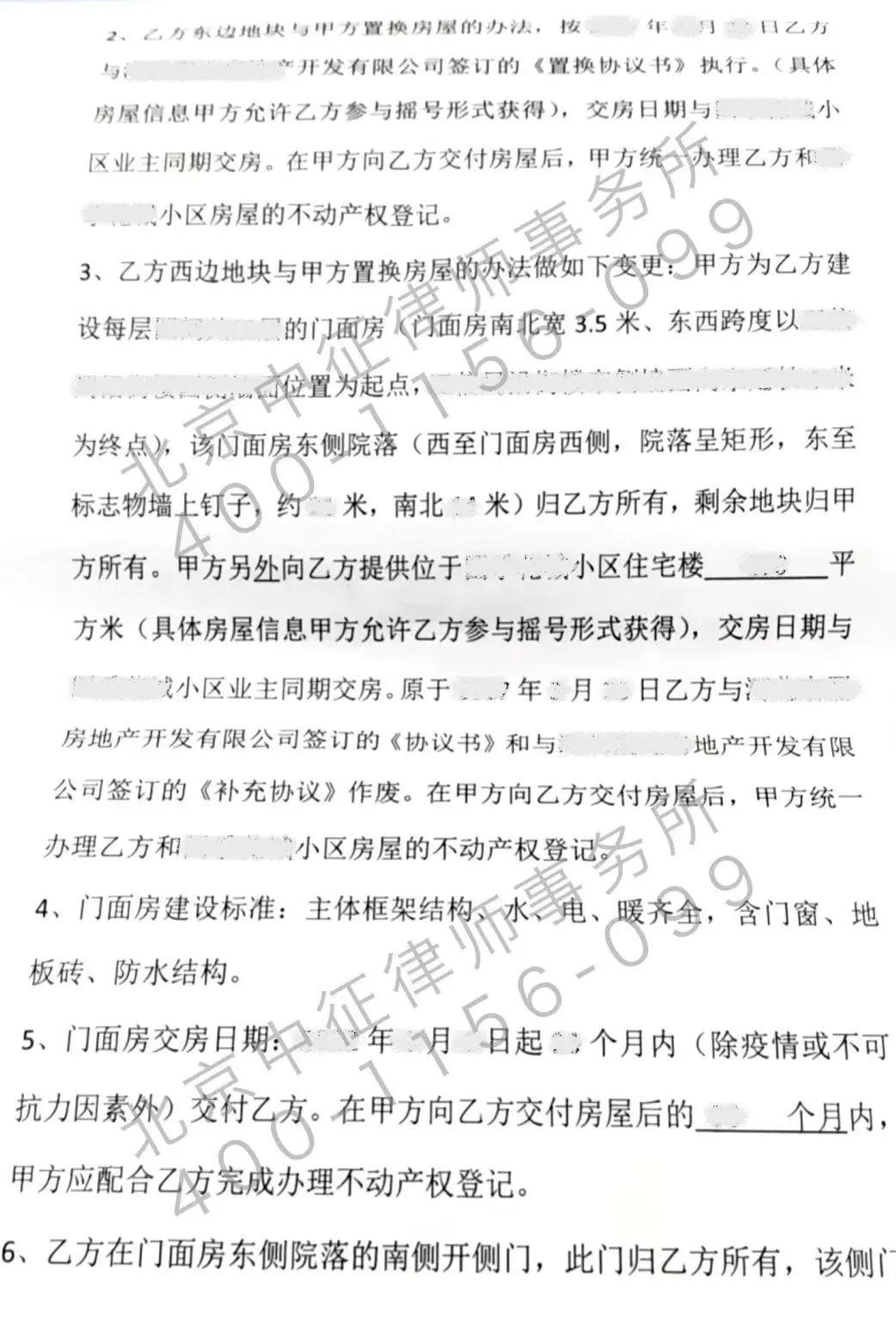 家住河北省保定市的杨先生有两处宅基地,2017年与开发商签署补偿协议,其中一份协议内容已经确定,但是开发商一直未能实现当初的承诺予以分配房屋,另外一份协议既没有具体的签署时间,也没有明确具体的补偿内容,属于关键条款约定不清楚。中征律师团队仅用不到1个月的时间,依法为当事人杨先生争取到了满意补偿,高效结案:补偿标准从9间临街商铺提高为12间,加一套150平方米的安置楼房!