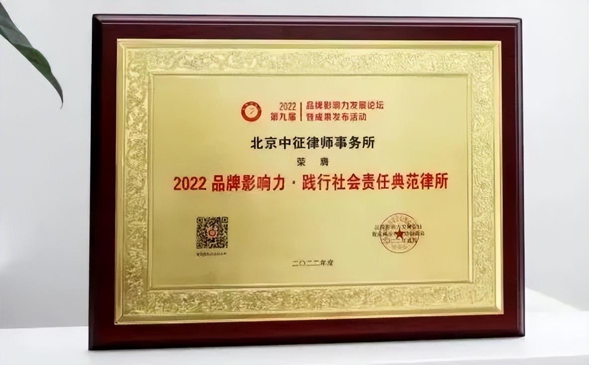 在第九届品牌影响力发展论坛暨成果发布活动中,北京中征律师事务所凭借在业界影响力、创新力、社会担当等方面的突出表现,荣膺“2022品牌影响力·践行社会责任典范律所”和“2022品牌影响力·法律行业创新榜律所”两项大奖。