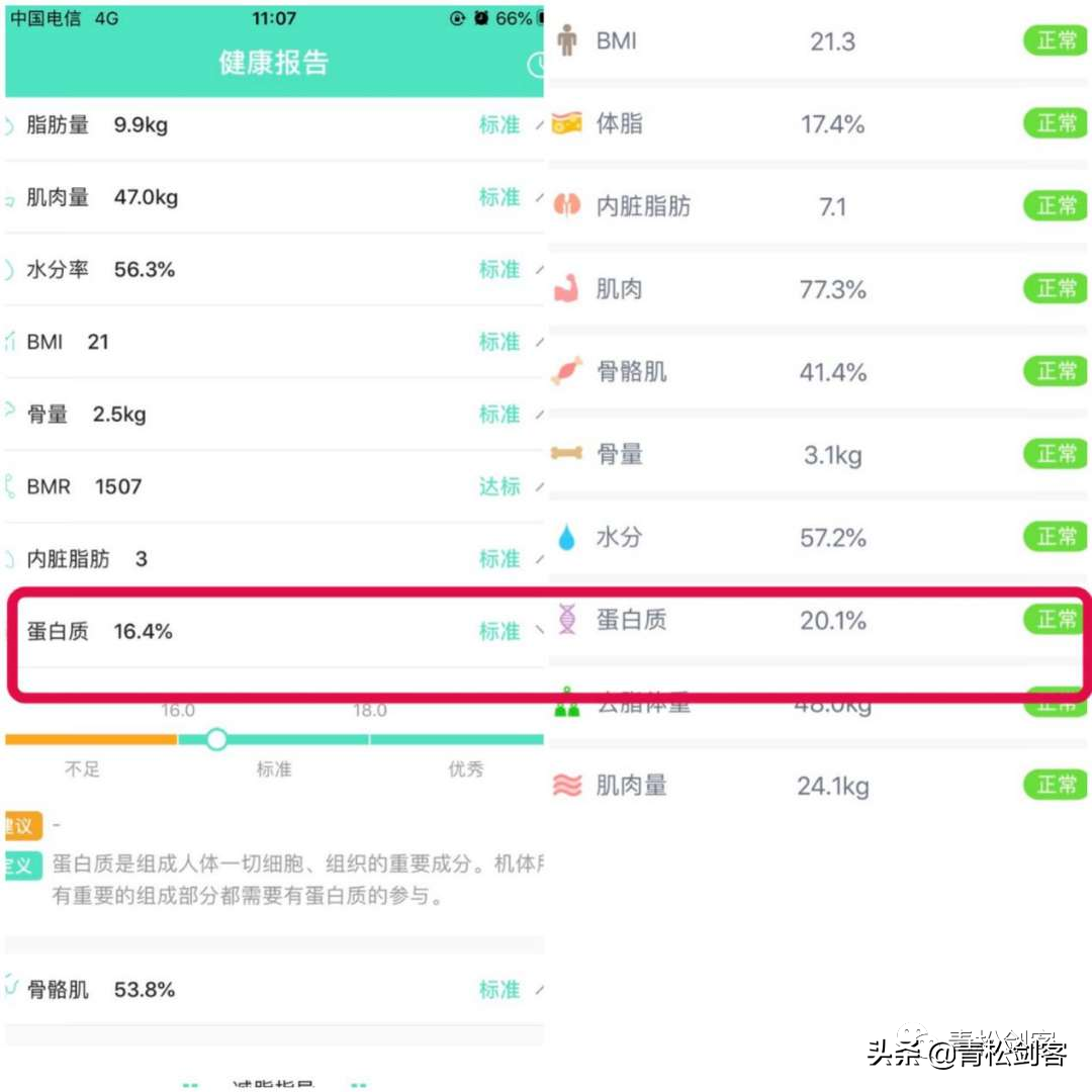 优减体脂称蓄意调低人体蛋白质含量,以达到让客户补充蛋白质,多吃优减的作用,左边为优减体脂称,右边为多锐体脂称